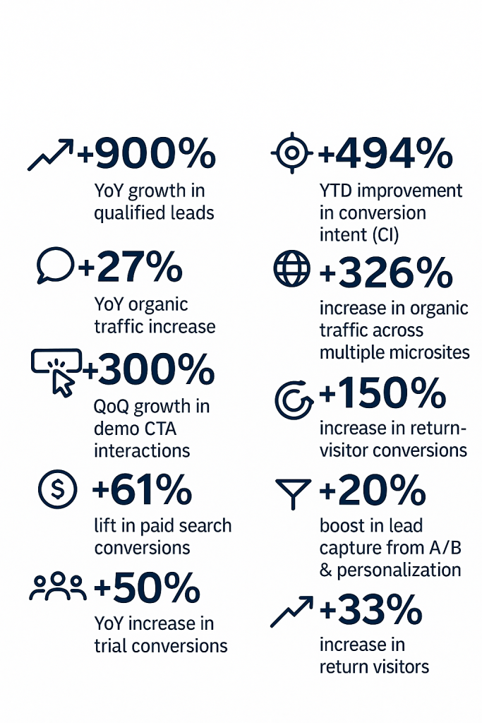 My work blends UX, content, analytics, and CRO to create experiences that convert — across enterprise websites, product pages, trial flows, and demo funnels.